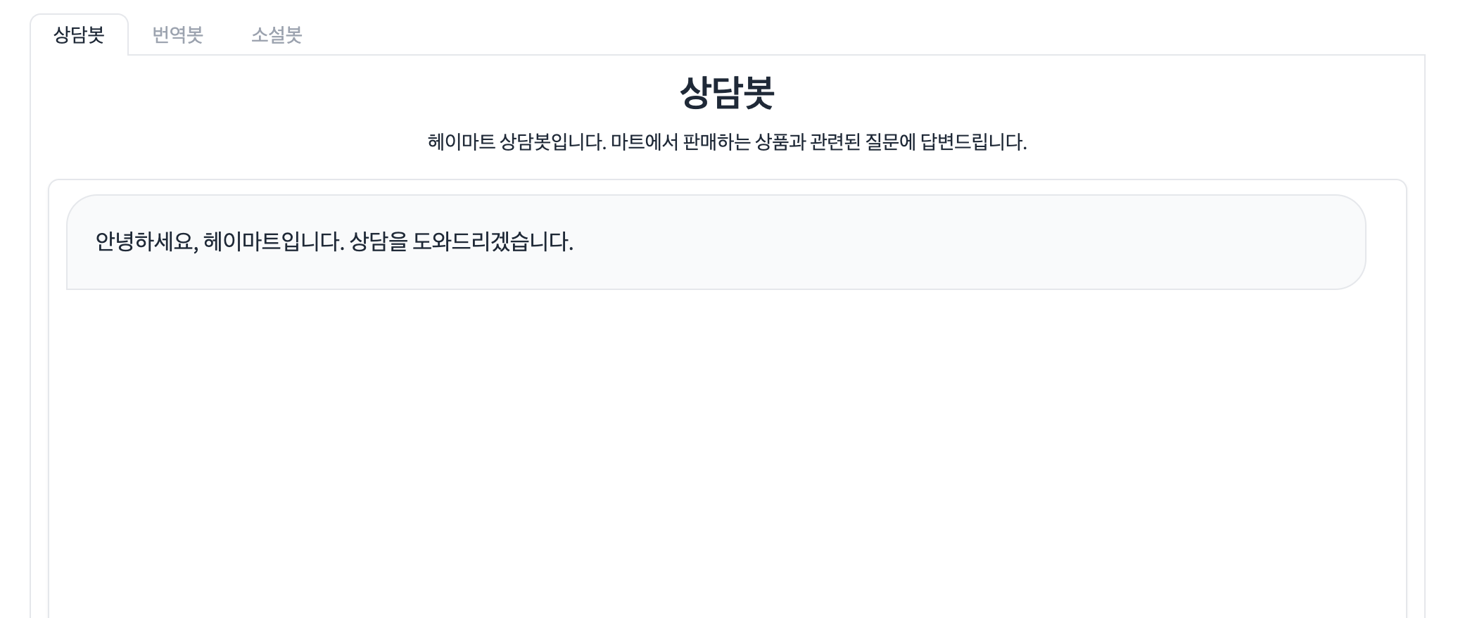 <center>헤이마트 상담봇입니다. 마트에서 판매하는 상품과 관련된 질문에 답변드립니다.</center>