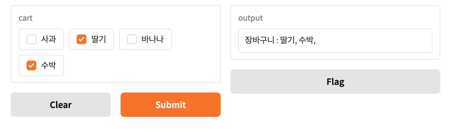 gr.CheckboxGroup(["사과", "딸기", "바나나", "수박"]),