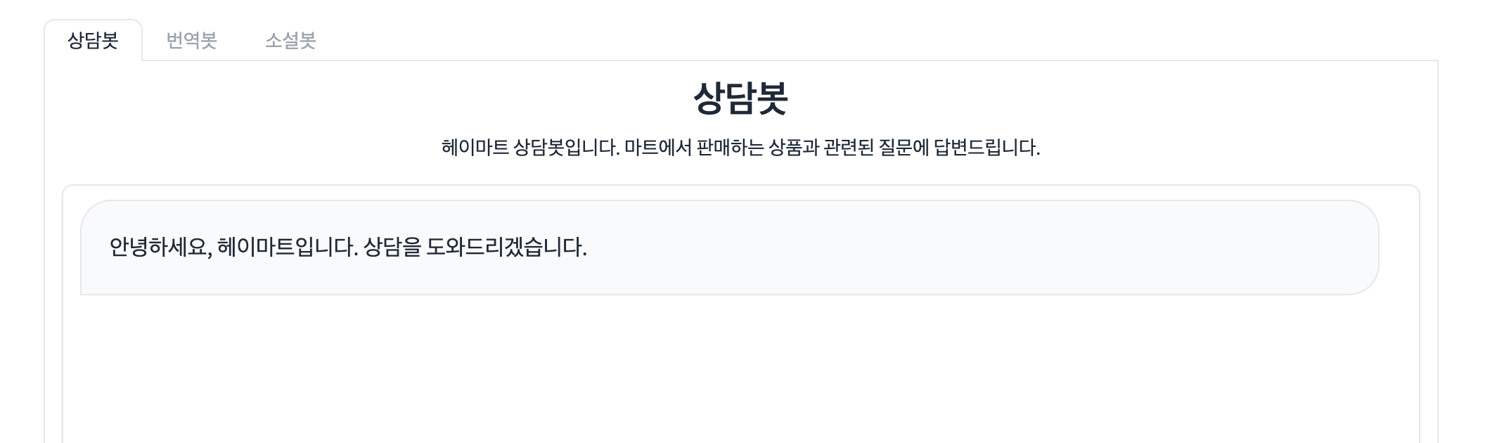 <center>헤이마트 상담봇입니다. 마트에서 판매하는 상품과 관련된 질문에 답변드립니다.</center>
