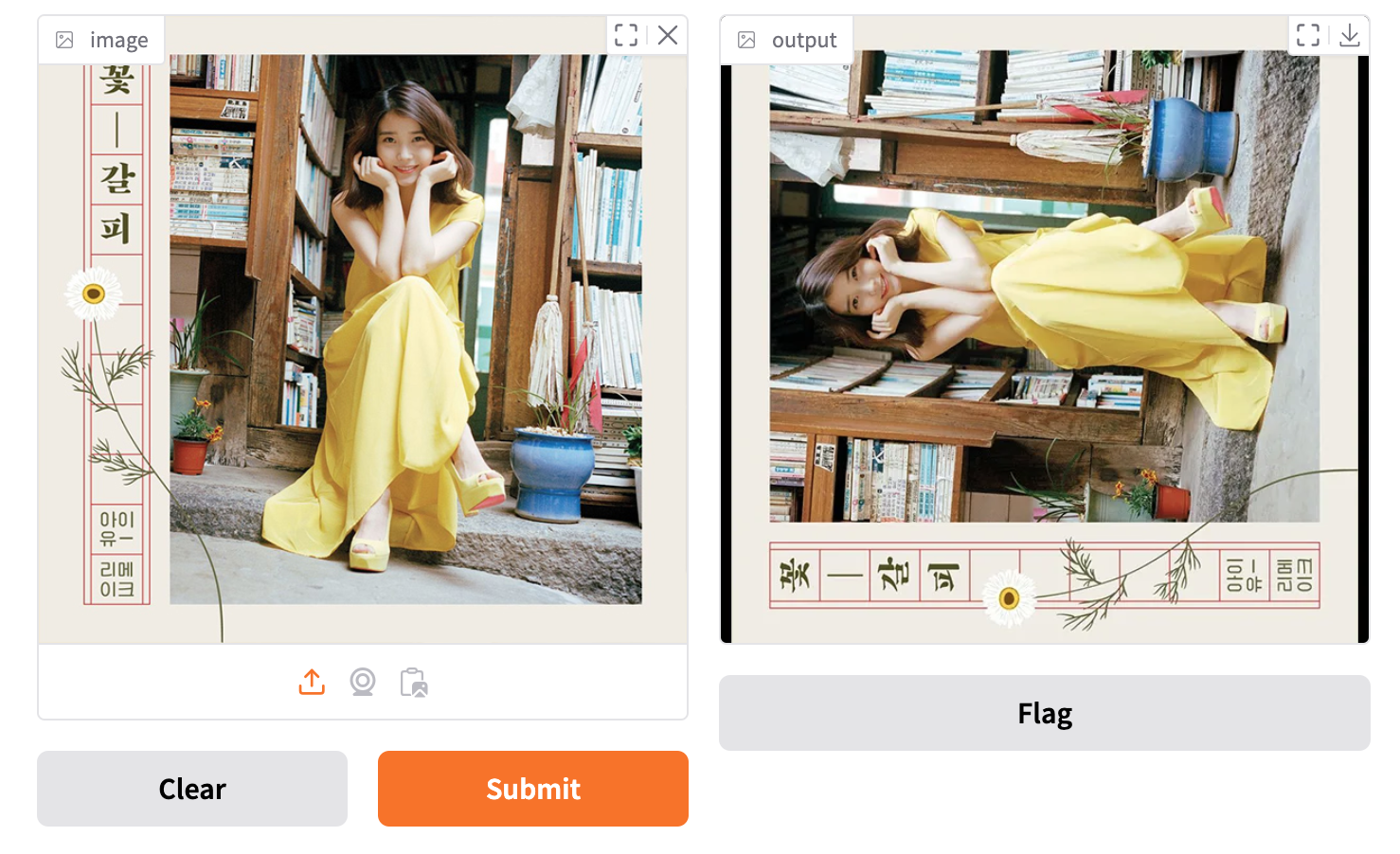 gr.Image() 컴포넌트를 사용할 때 미리 예제 등을 넣어 호출할 수도 있다. 아래 코드는 gr.Interface()에 4번째 매개변수 examples에 리스트로 예제 이미지의 경로를 지정했다. 그리고 inputs에 기본값으로 이미지를 입력하기 위해 gr.Image() 컴포넌트에 value 속성을 사용하여 앱이 실행될 때 value에 해당하는 이미지가 inputs에 출력되고 있다.