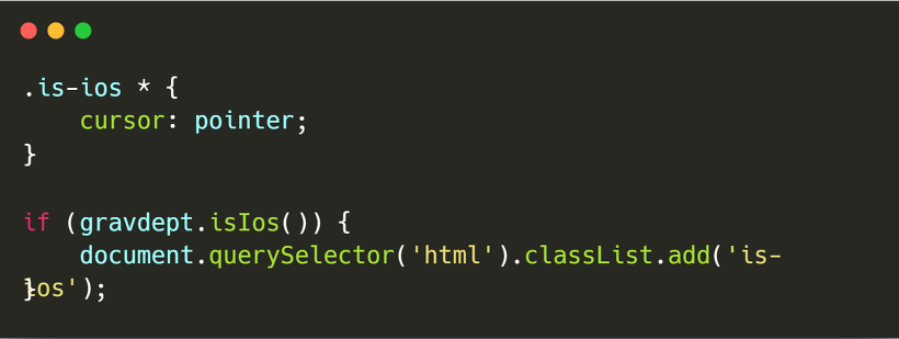 클릭 할 수없는 요소의 CSS를 클릭하면 버블링을 발생시킬 수 있습니다. iOS가 동작을 수정할 때마다 쉽게 제거 할 수있는 코드의 목적을 캡슐화하기 위해 Sass 믹스인을 만들 수 있습니다.
