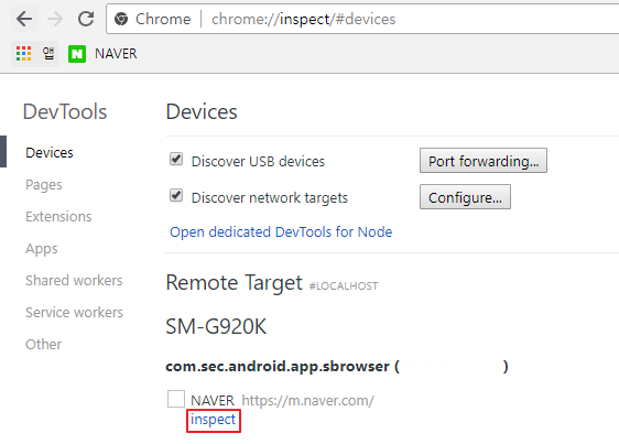 Android 디바이스에 켜둔 브라우저나 앱을 inspect할 수 있다.