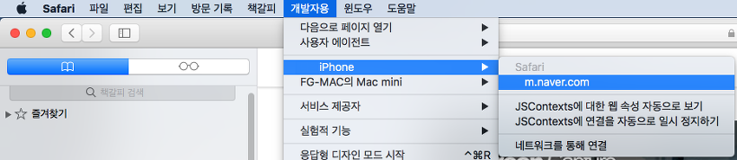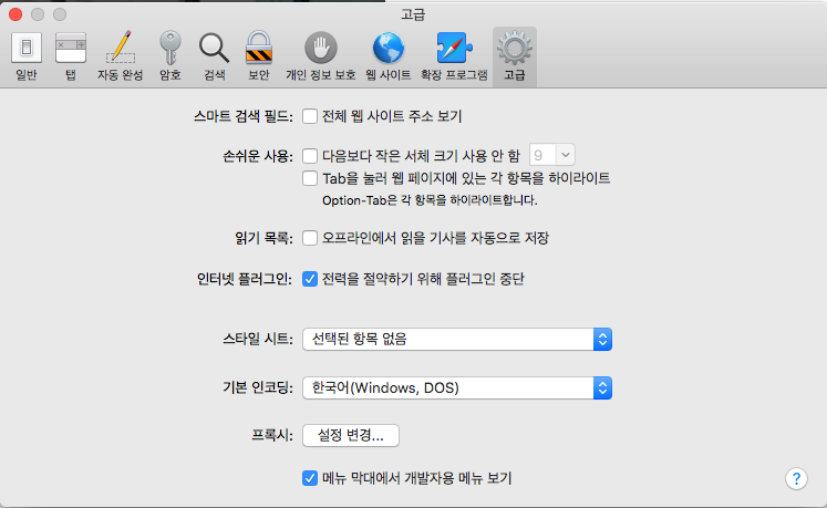 Mac의 Safari에서 환경설정-고급-메뉴 막대에서 개발자용 메뉴 보기 활성화 시키기